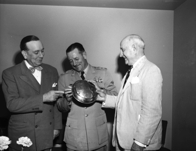 A group of smiling men. Among these men is: Amon Carter, right, and Major General Roger Ramey.