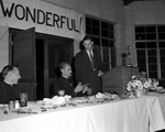 Image shows an awards ceremony. On podium is Don Fischer, president of the Fort Worth Senior Catholic Youth Organization. Left of Fischer is Reverend Herbert Vogelpohl receiving a plaque of appreciation at a Surprise dinner for Laneri High School teacher. Two unidentified people on far left and right of table. Published in the Fort Worth Star-Telegram morning edition, June 4, 1950.