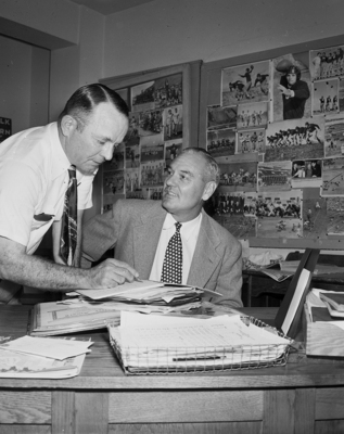 Image shows L. R. (Dutch) Meyer,left, and Amos Melton, the new business manager and information chief of athletics. They are shown to be in a room with Football photos. Published in the Fort Worth Star-Telegram morning edition, June 4, 1950.