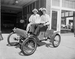 Antique cars. Johnny Grossman and E. E. Stovall on 1903 Oldsmobile.