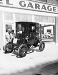Antique cars. Sam Arnholz and Frank Allen with 1898 Woods Electric.