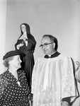 St. Rita's Catholic Church dedication. Mrs. Felix H. Jewell with Reverend B. Mysliwiec and 1908 Mission statue.