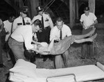 Attempted drowning. Ambulance attendants Steve Hopper, and Jim Brady carry Mrs. Lokell Hudson, who attempted suicide by drowning. Police officers B. T. Nash, and W. D. Meador look on.