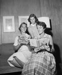 Monterrey Tech Summer school students, 1-r Kay Rhodes, Sandy Treff, and Frances Shields. They will be leaving by bus July 11 or by plane July 12 for a six week vacation travel school at Monterrey Tech in Monterrey, Mexico. They can be seen holding books in Spanish.