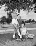 Linda Kay Arnett, left, with Janie Heard receiving some sun under a tree. Linda is an instructor at the TCU baton twirling camp. Janie is a Marble Falls High School Freshman attending the camp.