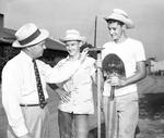 Presenting hoe and shovel for inspection by J.E. Chastevens, left, park operators' superintendent, are Jerry Culbertson, center, and Arvel D. Boatner, left. They are two of three students working for the department this summer.
