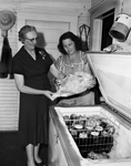 Mickey Weaver family. Farm and ranch. Mrs. Weaver, right, shows turkey from the home freezer to Miss Laura Tharp Concho County home demonstration agent.