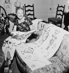 Miss Shirley Waldron, a fabric designer. She is displaying her own fabric designs over a couch. The fabric designs contain doodles.