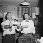 John Jervis, left, and Harvey Townsend getting their first sight of the 10 per cent raise granted to the Post Office employees. They are both smiling looking at their checks. They are employees of the Central Post Office.