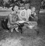 Rev. Nathan Finch, pastor of North Side Calvary Baptist Church, with his family at Trinity Park. Members of the congregation got together for an after service lunch. Mrs. Finch can be seen lifting lids while her husband holds their baby Kevin on is left knee, and Kim, 2 months , on the other.