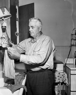 Image shows O. K. Giles, Pyatt, Arkansas, holding shirt. Giles pulled Corporal Herschel Bigelow, Carswell Air Base, from the flaming wreckage of a Continental Trailways bus in Dallas. Giles, father of Police Lieutenant E. L. Giles, 3508 Grayson, lost clothing in his suitcase from fire and water damage. Published in the Fort Worth Star-Telegram morning edition, June 6, 1950.
