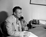Image shows W. A. Hotchkiss, Grand Praire Utility man, is named director of the East Texas Chamber of Commerce. Hotchkiss is shown holding a telephone at his desk. Hotchkiss has been the president of Grand Praire twice. Published in the Fort Worth Star-Telegram evening edition, April 28, 1952.