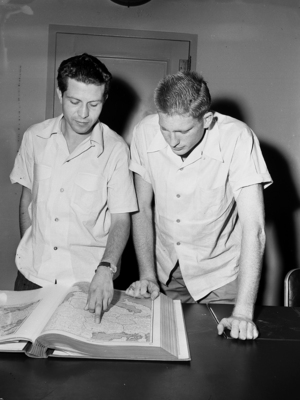 Image shows Henry Flak, left and Larry Hanks pointing at Poland in book. Published in the Fort Worth Star-Telegram evening edition, June 7, 1950.