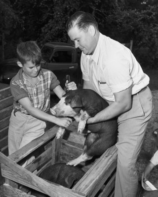 Image shows Hubert Boyd, Azle 4-H Club boy, and Bert Olsen, Azle 4-H leader lifting Hubert's Poland China gilt out of its box. This is so Hubert can start his swine program. Published in the Fort Worth Star-Telegram morning edition, June 7, 1950.