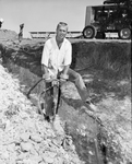 Harry Moreland, TCU halfback, gets in shape for coming season by operating air hammer while installing water line at Amon Carter Stadium.