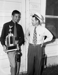 Image shows Jimmy Calhoun, son of Mr. and Mrs. W. M. Calhoun, smiling as he shows his coach, Glen Tole, trophy and ribbon he won at Gonzales contest. Jimmy won the junior championship and the reserve grand championship with 12 fowls. He is a 4-H Club member and Tole is assistant Tarrant County farm agent. Published in the Fort Worth Star-Telegram evening edition, June 7, 1950.