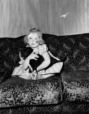 Image shows Linda Pennington, 3, holding her puppy, Tippy. Linda Pennington risked her life to save her dog, Tippy from being struck by a car at her home, 2121 Ellis. The car missed Tippy but hit Linda. The driver took Linda and her mother to the hospital. Her wounds included a cut by the eye, a skinned face and knees. Published in the Fort Worth Star-Telegram morning edition, June 7, 1950.