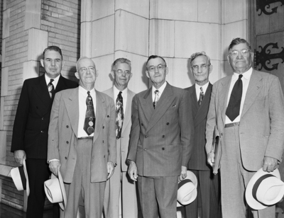Image of six men standing in front of a wall, wearing suits. From left to right, Rev. Clyde Pittman, Gorman; Rev Frank O'Hearn, Coleman; Rev T. D. Ellis, Cleburne; Rev. L. M. Lawson, Azle; Rev. B. B. Edmaiston, Midlothian; and Rev. Beo Kornegay, Fort Worth. (no clipping)