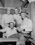 Meeting with President Allen Guinn (seated right) of Mineral Wells, officers of the West Texas Gold Association complete plans for the annual men's West Texas meet at Glen Garden. Included are Secretary Ray Woodson (kneeling) of Mineral Wells, Tournament Chairman Erie Turner (left) of Fort Worth and Exec. Committeeman Ned Robertson, Brownwood. Published in Fort Worth Star-Telegram, morning edition June 07, 1950.