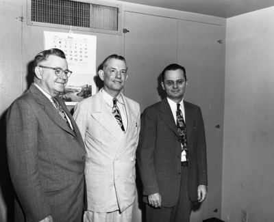 Image shows, left to right, J. A. Murrell, Ed Shine, and W. T. Bruegmann. J. A. Murrell, was the president of the T&P Employers Recreation Club, a sponsor of the T&P Minstrels' Star-Telegram Milk and Ice Benefit. The benefit was a part of the Texas and Pacific Railways effort to fill as many quarts of milk as possible for underprivileged children. Published in the evening edition, June 7, 1950.