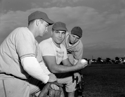 Image shows three members of Arlington Heights baseball team. Coach Nick Ruggieri, center, is shown conversing with Bob Miller, left, and Jack Dilliard, right, on strategy in the state City Conference baseball tournament in Houston. Published in the Fort Worth Star-Telegram evening edition, June 7, 1950.
