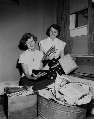 Image shows two girls sorting through old letters and magazines. Nelda, left, and Corene Appleby, 1100 Central. Clearing out old letters and magazines from a window box was a duty to get rid of trash from their home. Published in the Fort Worth Star-Telegram morning edition, June 8, 1950.