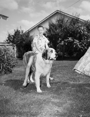 Favorite mount of 9-year-old Philip Guttman, son of Mr. and Mrs. dick Guttman, operators of Dot's Kitchen in Mineral Wells, is his 200-pound St. Bernard, Connie. Connie delights in lazily "bucking off" her 45-pound rider from time to time. Published in Fort Worth Star-Telegram evening edition June 10. 1950.