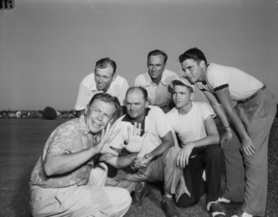 Dan Greenwood of Fort Worth holds up 10 fingers representing the 10-under-par 61 which gave his team first place in Wednesday's pro-am at the annual men's West Texas golf tournament at Glen Garden. Others are, left to right, front row, Pro Morgan Hampton, Bill Allison, and Reed Sayles, all of Abilene, and back row, left to right, Henry Richards of Jacksboro and Bill Walton, Breckenridge. Published in Fort Worth Star-Telegram, evening edition June 08, 1950.
