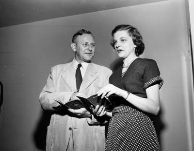 Image shows Ernest F. Schumacher who is explaining passports to his daughter , Miss Joyce Schumacher. Ernest F. Schumacher first visit back to Germany in 28 years. Published in the Fort Worth Star-Telegram evening edition, June 10, 1950.