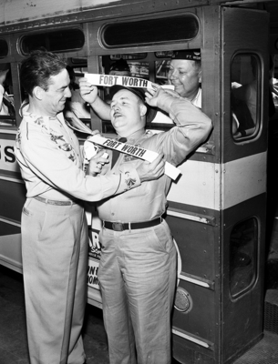 Image shows Corporal L. J. Nordine from Carswell Air Force Base protest that its against regulation as Ray Bertholf,left and C. C. Downs, on bus, attempt to put Fort Worth hatbands on him before American Legionaires boarded bus for Breckenridge Rodeo. Published in the Fort Worth Star-Telegram morning edition, June 8, 1950.