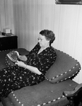 Image shows Miss Mabel Wilkinson, Mineral Wells School nurse for 26 years, displays a plaque given to her by the school board. She is shown inspecting the plaque on a couch. Published in the Fort Worth Star-Telegram morning edition, June 17, 1950.