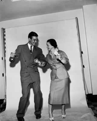 Image shows Tom Abbott III with his mother , Mrs. Tom Abbott II. His mother is showing him how to Charleston. Published in the Fort Worth Star-Telegram evening edition, June 8, 1950.