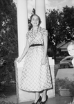 Image of Miss Pat Sammons, she is a recent graduate of the University of Texas, sailed from New York to spend the summer traveling in Europe. she is the daughter of Mr. and Mrs. A. B. Sammons, 3836 South Hills. She is wearing a patterned dress and standing in front of a column. Published in Fort Worth Star-Telegram morning edition June 25, 1950.