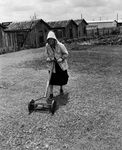Image shows Mrs. C. H. Jacks, elementary teacher in Fort Worth Public Schools, attending her garden. She is shown wearing a bonnet and gloves while using a push lawn mower at her home, 3122 Hunter. Published in the Fort Worth Star-Telegram morning edition, June 9, 1950.