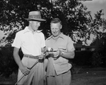 Jim Simpson, left, and Billy Maxwell of Odessa laughingly discuss a driver's best points after the two had fired 69s for a share of medal honors in the Men's West Texas tournament. Published in Fort Worth Star-Telegram, morning edition June 08, 1950.