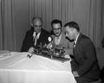 Three members of the research project are shown left to right: P. P. Spafford, Stanolind Oil & Gas Company, Houston, E. C. Greco, United Gas Pipe Line Company, Shreveport, and J. A. Grimshaw, The Chicago Corporation, Caarthag. They are studying a well-tester used on gas-distillate wells which form the basis of the corrosion project. Published in Fort Worth Star-Telegram morning edition June 9, 1950.
