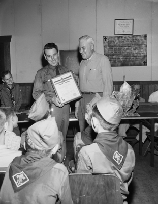 Members of Boy Scout Troop 143 see their new charter which Council Commissioner Herb Hilderbrandt, left, has just presented to Scoutmaster Joe Waggoner. The presentation was made at a court of Honor in the Castleberry Methodist Church. A man holding a plaque smiling and another man standing by him looking at him smiling. They are standing in front of kids in uniforms. Published in Fort Worth Star-Telegram morning edition, June 9, 1950.