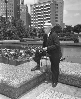 S. Herbert Hare, Fort Worth Park and City Planning consultant, posing by fish pond in Burk Burnett Park, looking east toward 7th Street