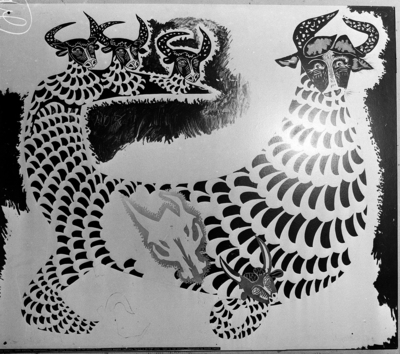 Image of Jean Lurcat commission of a 520 square-foot tapestry for Assy's Notre Dame de Toute Grace which will depict the garden of Eden and The Apocalypse, to be hung in the church choir. This sample of the tapestry is part of the Modern Church Art exhibition currently at the Fort Worth Art Association gallery in the Public Library. Published in Fort Worth Star-Telegram morning edition June 18, 1950.