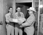 Burton Ellis, left, and Buster Kilpatrick, center, received Fort Worth-made "Texas Hats" from Tom Peters to wear to the Jaycee national convention in Chicago, June 13-17. Published in Fort Worth Star-Telegram morning edition June 10, 1950.