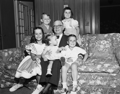 Five reasons for enjoying his position as grandfather are shown with Gaylord J. Stone. Front, left to right, are Kitsy, Jan and Bill Waltman; back, left, is George Wolff Jr., and back, right, Malinda Lore. Published in Fort Worth Star-Telegram morning edition June 18, 1950.