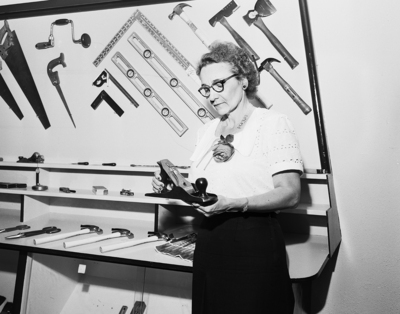 Mrs. Roy D. Martin, one of the few women who own and operate a lumber yard, is shown at a hand tool display rack in the new display room of her office. Published in Fort Worth Star-Telegram morning edition June 11, 1950.