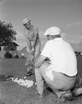 After winning two matches in the Men's West Texas golf tournament at Glen Garden Country Club, Ernie Vossler, left, checks with Newt Blevins, one of Pro Smiley Rowland's assistants, before a practice session. Published in Fort Worth Star-Telegram evening edition, June 10, 1950.