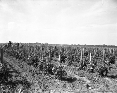 Image shows tomato crop at Retrieve farm. Every prison farm used these stakes for tomato crops. Published in the Fort Worth Star-Telegram morning edition, July 2, 1950.