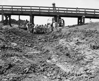 Image shows convicts performing drainage work and machinery at Ramsey Prison Farm in Brazoria County. The crew working is the Ramsey baseball team "The Hard Hitters". The prisoners are shown to be below a bridge. Published in the Fort Worth Star-Telegram morning edition, July 2, 1950.