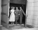 Image shows a wedding shot of Mrs. John E. Halkias. There are three people in the wedding shot beside Mrs. John E. Halkias, from left to right, unidentified, Mr. John E. Halkias and unidentified. Her name was Miss Grace Godby before her marriage at First Methodist Church Chapel. She is the daughter of Mrs. Tom Vaden, 130 Coventry Pl. Mr. and Mrs. Halkias will live at 109 S. Judkins. Published in the Fort Worth Star-Telegram evening edition, June 12, 1950.