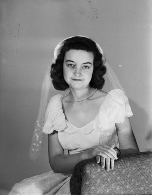 Miss Wanda Sue Brinkley, and Robert Gayle Voss were married by Reverend James N. Morgan at the home of her parents, Mr. and Mrs. F. A. Brinkley, at 3212 Strong Avenue. Published in Fort Worth Star-Telegram morning edition, June 18, 1950. A woman in a white dress and veil.