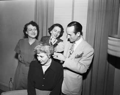 Lee Self, right, president of the Hair Finishing Council of America, explains the latest hair style worn by Mrs. Mayme Isbell, president of the Texas Association of Accredited Beauty Culturists. Mrs. Eunice Hausman, left, of Austin and Mrs. Hazel Wright of Fort Worth look on. Three women and one man all standing together looking different directions. Published in Fort Worth Star-Telegram morning edition, June 11, 1950.