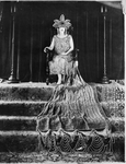 Copy of old photo of Ruth Haltom. A woman standing on a object wearing a dress.
