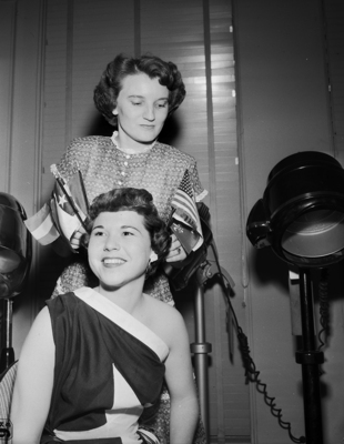 Miss Margie Hoffman, rear, dressed the hair of Miss Peggy Hardy to win first place in a contest sponsored by the Texas Association of Accredited Beauty Culturists. Published in Fort Worth Star-Telegram morning edition, June 13, 1950.